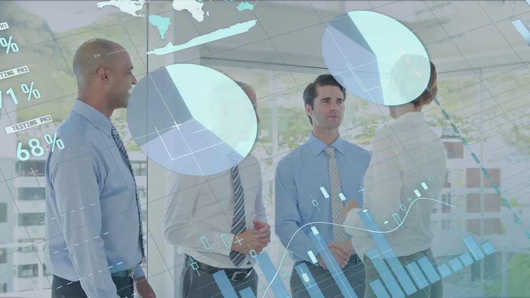 Group of business professionals shaking hands can be interpreted as a moment of successful collaboration or deal-making. The digital data and graphs overlay suggests concepts of global business, analytics, and technology-driven environments. Suitable for use in articles or presentations about modern business practices, teamwork, innovative data solutions, or corporate strategy discussions.
