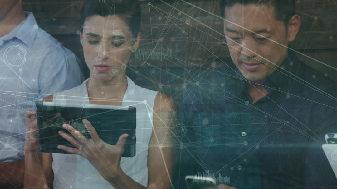 Business professionals interacting with digital tablets and smartphones complemented by a virtual data network overlay. Useful for illustrating themes of global connectivity, technology integration, or modern business environments. Perfect for marketing materials, tech-related publications, or presentations focused on data analysis.