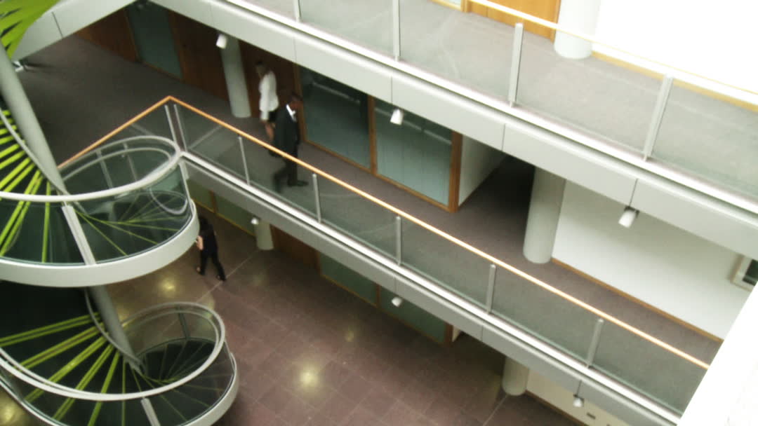 Business Professionals Walking in Multi-Level Office Lobby Video