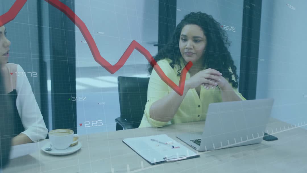 In modern corporate office, team is engaged in intense discussion about financial challenges and sales trend downturn shown in transparent graph overlay. This visual is useful for business presentations, illustrating challenges and decision-making processes, or resources on improving strategies during financial setbacks.