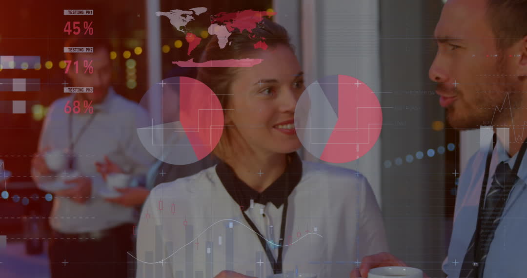 Young business professionals analyzing data in a social setting. Digital graphics overlay with charts and statistics symbolizes data-driven decision making in a global context. Useful for themes related to team collaboration, modern work environments, and technology in business.