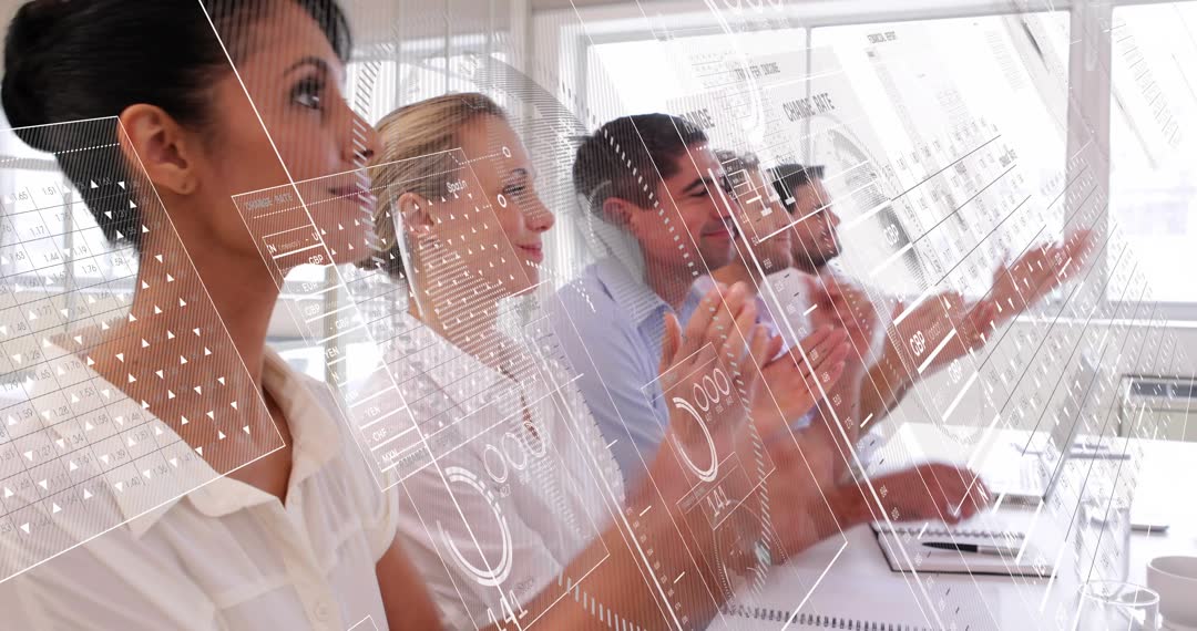A group of business professionals engaged in studying digital data displayed on virtual overlays during a meeting. They appear focused and enthusiastic as they nod in agreement and applaud. Ideal for depicting corporate teamwork, modern technological environments, and data-driven strategies. Suitable for business, technology, and innovation-themed content.