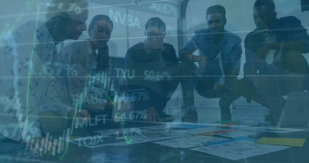 The business-themed setting features a team working together, discussing strategies, showcased over financial charts that reinforce concepts of analysis and data processing. This video is ideal for use in articles about team collaboration, office productivity or stock trading opportunities.