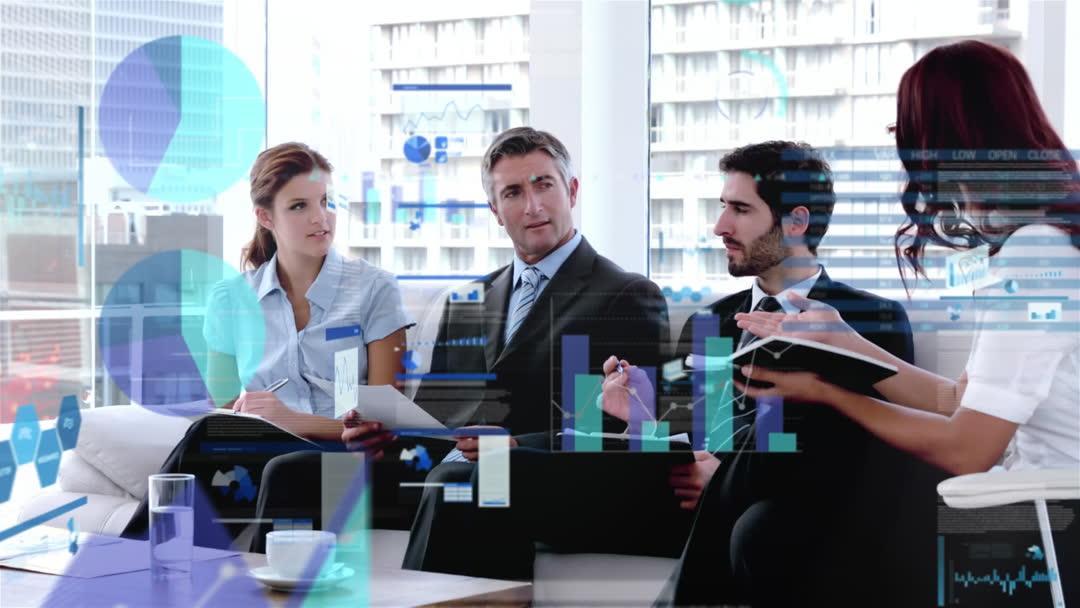 Business professionals engaged in discussion with digital graphs and statistics overlaying scene. Suitable for futuristic business, data presentation, and digital marketing concepts.