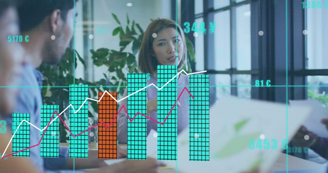 An office meeting scene with diverse colleagues collaborating, overlaid with animated data graphs. This scene reveals teamwork and modern business strategies. Useful for articles on business collaboration, data analysis trends, and digital transformation in professional settings.