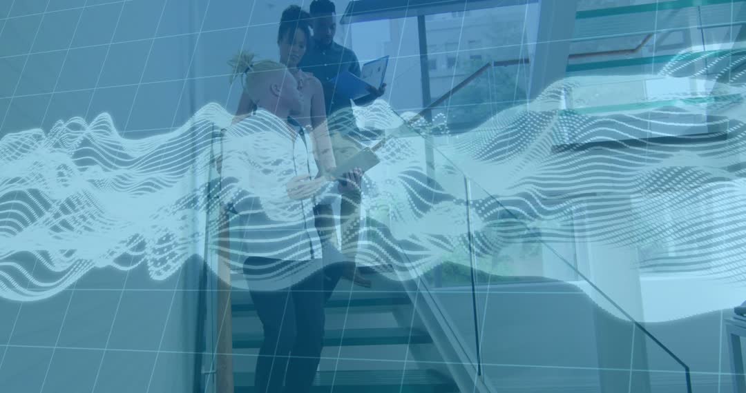 A business team walks down a sleek office staircase, engaging with technology through tablets and laptops. The wave-grid overlay suggests innovation and data handling, ideal for representing corporate culture, teamwork, and tech-driven collaboration. Useful for illustrating industry insights, modern analytics, and nine-to-five management scenarios.