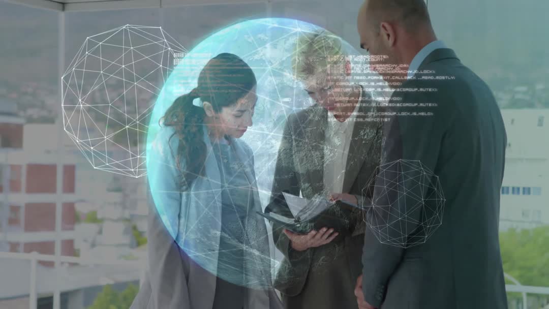 Business Team Analyzing Data with Holographic Globe Innovations Video