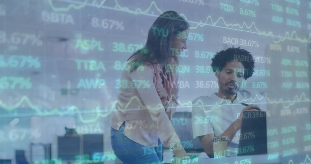 Image shows a diverse man and woman engaging in a discussion at a modern office while digital stock market data appears overlayed. Ideal for illustrating themes related to finance, economic trends, digital business practice, teamwork in corporate settings, and the use of technology in professional environments. Suitable for use in business reports, financial blogs, or technology magazines.
