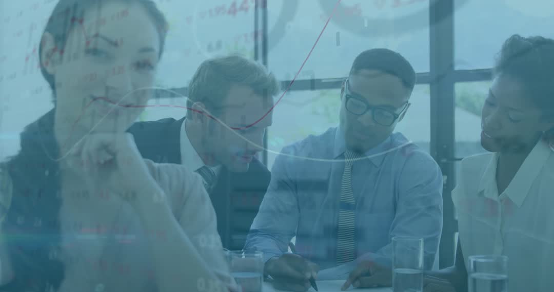Business professionals collaboratively reviewing documents with overlaid financial data graphs. The fusion of technology and teamwork highlights the dynamic of economic and financial analysis in a corporate environment. Ideal for illustrating financial planning, corporate collaboration, and strategic discussions in corporate magazines, financial service websites, and teamwork blog pieces.