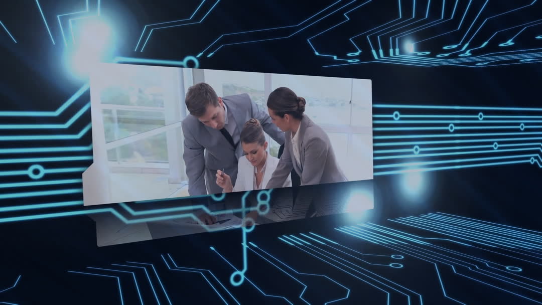 Design showcases business professionals collaboratinly analyzing strategy with animation of networks, representing technological connectivity. Ideal for presentations on digital transformation, corporate strategies, technological advancements, or cybersecurity solutions.