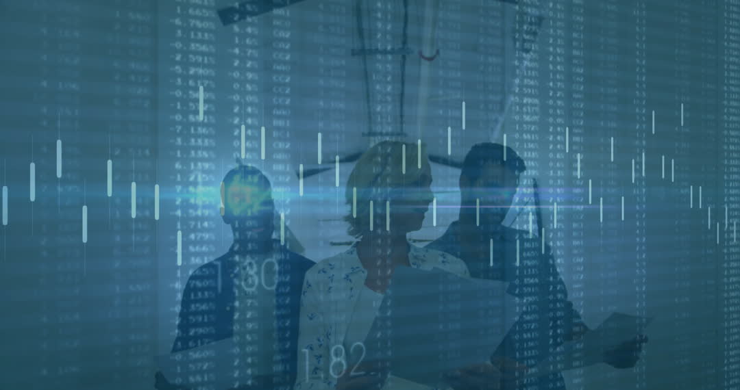 Scene portrays a team of diverse business professionals in an office environment analyzing financial data. The overlay of digital charts and numbers suggests active data processing and global finance engagement. Ideal for illustrating themes of teamwork, business strategy, technology's role in modern finance, and international data analysis applications.