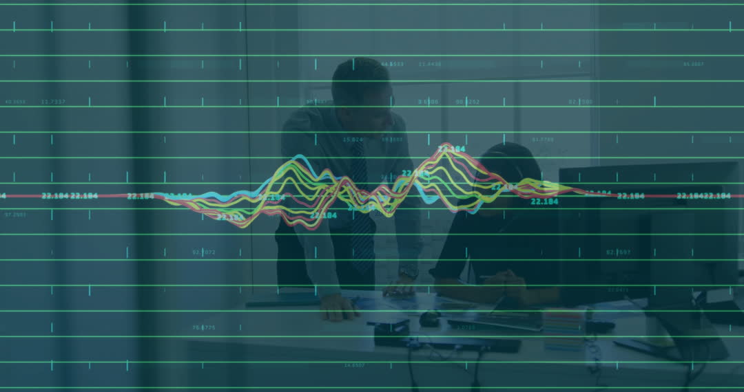 Diverse businesspeople engaging in detailed discussion over dynamic financial graphs provide a strong theme of collaboration and analysis. Overlay of colorful graphs suggests an emphasis on strategic thinking and interpretation of market data. This visual could be used for articles on economic trends, business cooperation, or promotions related to financial services, data through storytelling, or strategic consulting services.