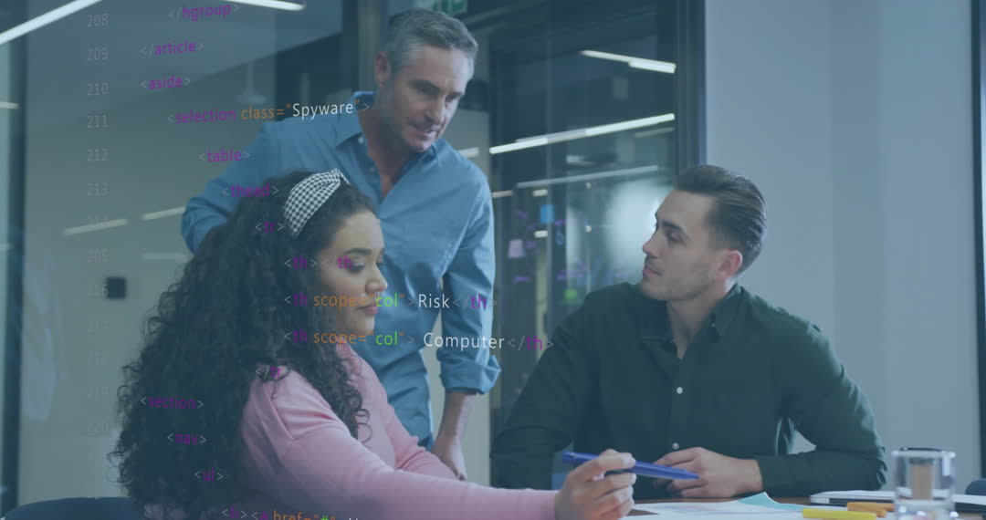 A team of professionals collaborating in a modern, technologically advanced office setting, analyzing financial data and discussing innovative solutions. They are surrounded by digital projections of data and computer code, highlighting the importance of technology in today's business environment. This visual can enhance corporate presentations, focus on teamwork and collaboration, and underscore themes of technological innovation and financial strategy in marketing materials.