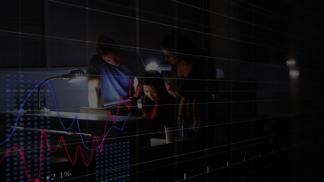 Diverse business team collaborates late at night, analyzing financial data and trends using a computer. Overlapped with financial graphs, emphasizing investment and analytical themes. This visual is ideal for illustrating late-night work culture, financial services, teamwork, technology in business environments, and data analysis concepts.