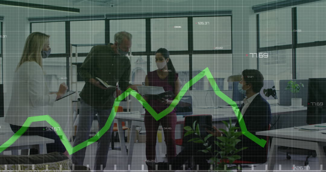 Image depicts a business team in a modern office environment, analyzing financial data with a digital graph overlay. Great for illustrating topics related to finance, teamwork, digital technology, and modern office work settings. Useful for articles, blog posts, or presentations focused on financial analytics, economic forecasting, and corporate teamwork.