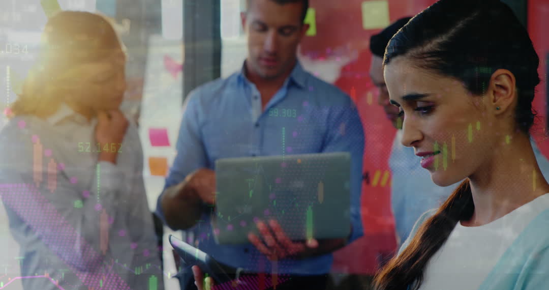Collage of diverse business professionals interacting with electronic devices while financial data graphics overlay the scene. Suitable for use in contexts related to business teamwork, financial technology, or data analysis. Ideal for illustrating concepts of modern business analytics, corporate strategy discussions, or global finance.