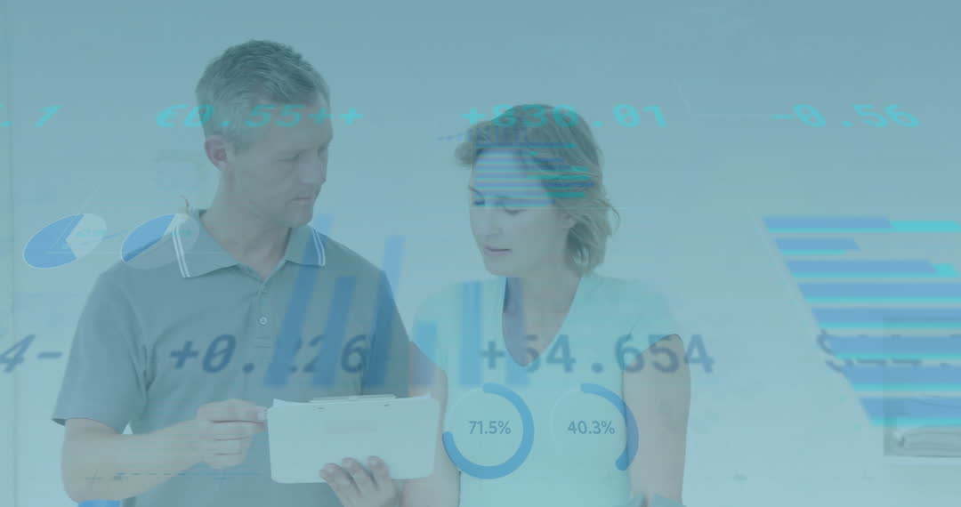 Professionals reviewing financial metrics on a tablet, with overlay of stock market charts. Useful for illustrating data analysis in business presentations, corporate teamwork dynamics, and investment strategy discussions. Captures modern approaches to analyzing financial trends within corporate environments.