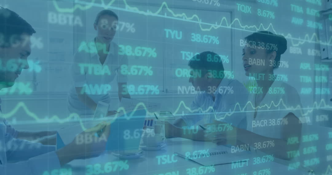 Diverse group of professionals engaged in a meeting with financial data graphs overlaid on the scene. Suitable for illustrating concepts related to global finance, stock market, business analysis, and team synergy presentations or reports.