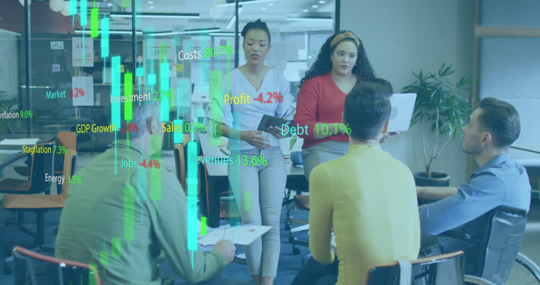 Diverse business team in office setting discussing financial data displayed as overlaid graphics. Ideal for illustrating concepts like modern business strategy, financial planning, analysis, corporate collaboration, economic trends, and technological integration within global commerce contexts.