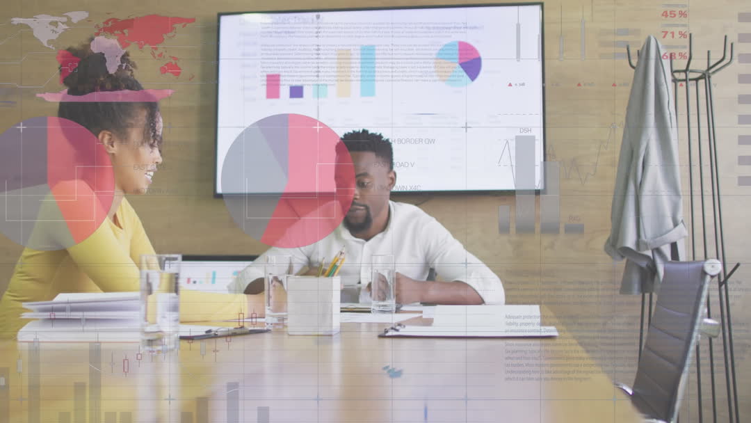 Business professionals engaged in analyzing financial data projections with digital graphs overlay. This video is suitable for illustrating financial strategy discussions, teamwork in corporate environments, or technology-driven data analysis in presentations and reports.