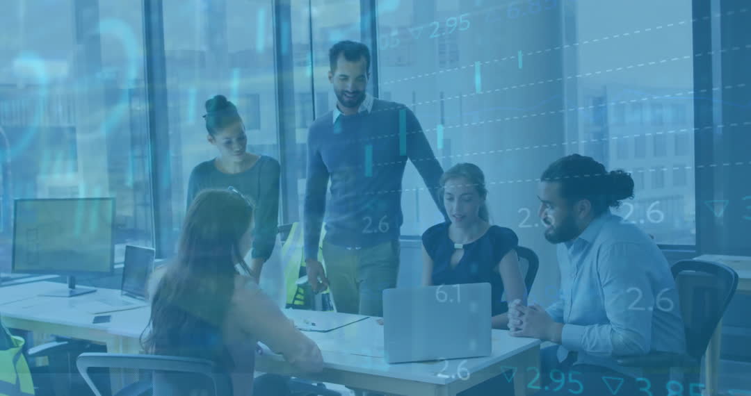 A team of diverse business professionals is shown analyzing financial data in an office setting, enhanced with graphic overlays of charts and numbers. The video conveys themes of technology incorporation and data-driven decision-making. Ideal for showcasing teamwork, modern business strategies, and corporate environments in reports, presentations, or articles about finance and analytics.