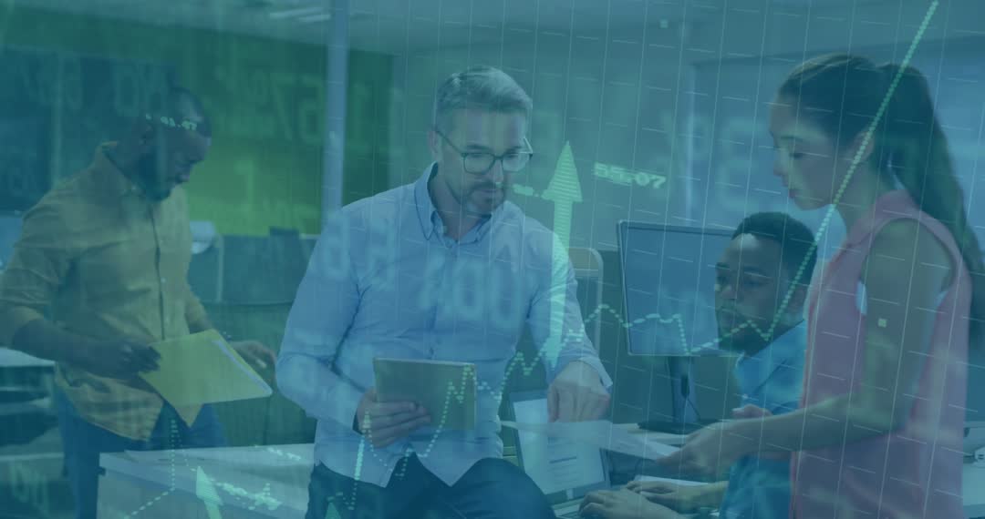 Dynamic video features a business team in office collaborating on financial analysis. Leader utilizes tablet to display data, exemplifying teamwork and decision-making skills. Animated charts and data visuals overlaying corporate environment underscore modern, tech-driven work space. Ideal for illustrating concepts of corporate strategy, data-driven decision-making, and professional collaboration in business settings.