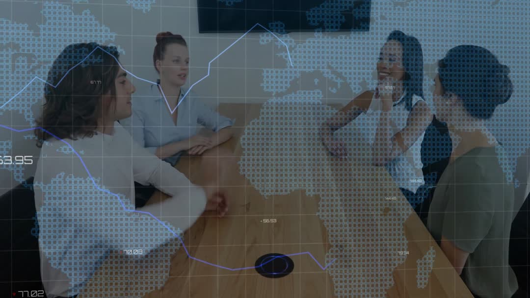 Accomplished team sitting around conference table actively discussing financial statistics with transparent world map and charts in background. Useful for illustrating concepts of corporate strategy, data-driven decision-making, international business development, innovative teamwork, and modern technological facilitation during meetings.