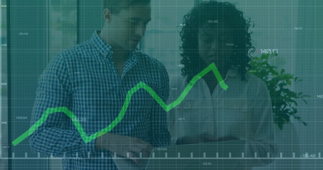 Team analyzing financial data with an animated green chart overlay indicates growth and development. Suitable for illustrating concepts related to financial analysis, teamwork, and business insights, ideal for use in presentations or reports on financial performance or strategy.