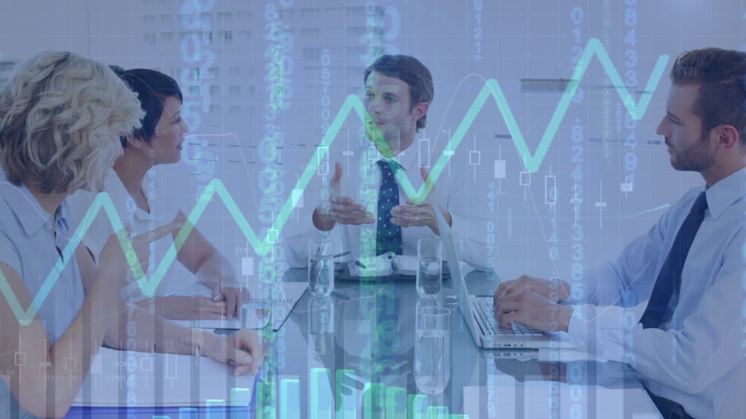 Business professionals having a meeting with data visualizations of financial and economic indicators layered over the scene. Highlights teamwork and data-driven decision-making abilities suited for presentations on corporate growth, market analysis, and strategy planning. Ideal for business-focused media, conveying collaborative problem-solving in a corporate setting.