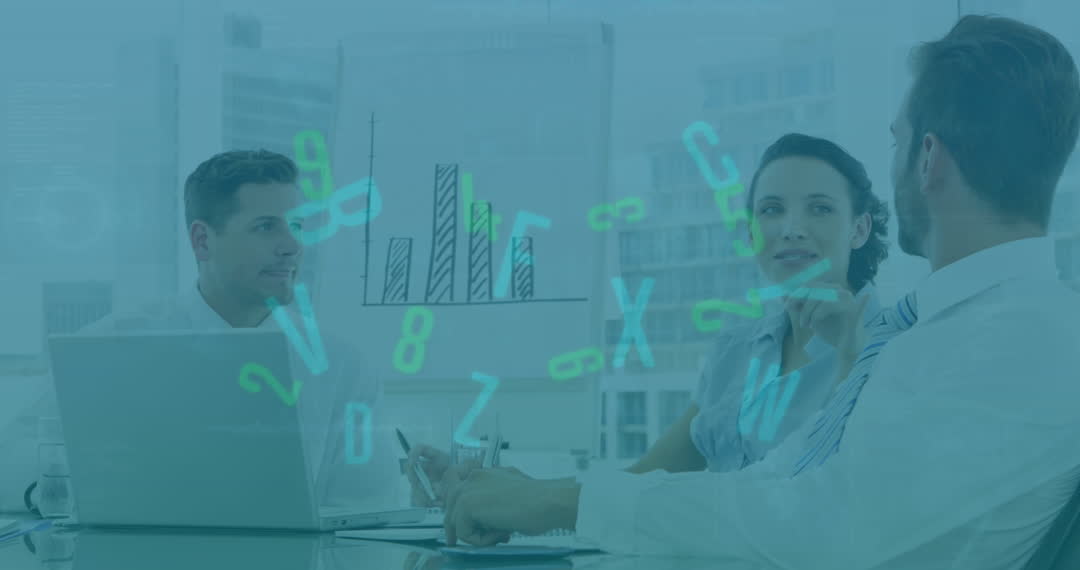 Business professionals in discussion, focusing on financial analysis and digital data visualization. Useful for illustrating teamwork in a corporate environment, financial analysis concepts, or digital transformation in businesses.