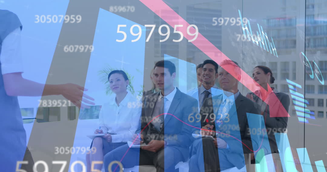 This photo depicts a diverse group of business professionals attentively analyzing financial trends and data visualizations in a modern office environment. With numbers and graphical elements superimposed, the scene suggests a focus on data-driven decision-making, market strategies, and corporate analysis. Useful for illustrating concepts related to business analytics, teamwork in finance, market research, economic presentations, and investment strategies.