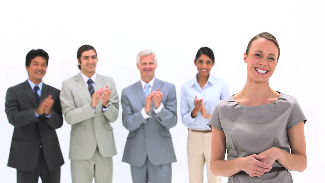 Business Team Applauding Successful Leader in Minimalist Setting Video