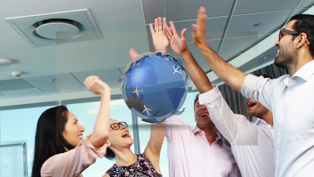 This video shows a diverse team of business professionals energetically raising their hands in celebration around a globe with digital connections videory. The animated globe signifies connectivity and technological advances. Perfect for promotional materials focused on corporate culture, teamwork, globalization efforts, and success in technology-driven enterprises.