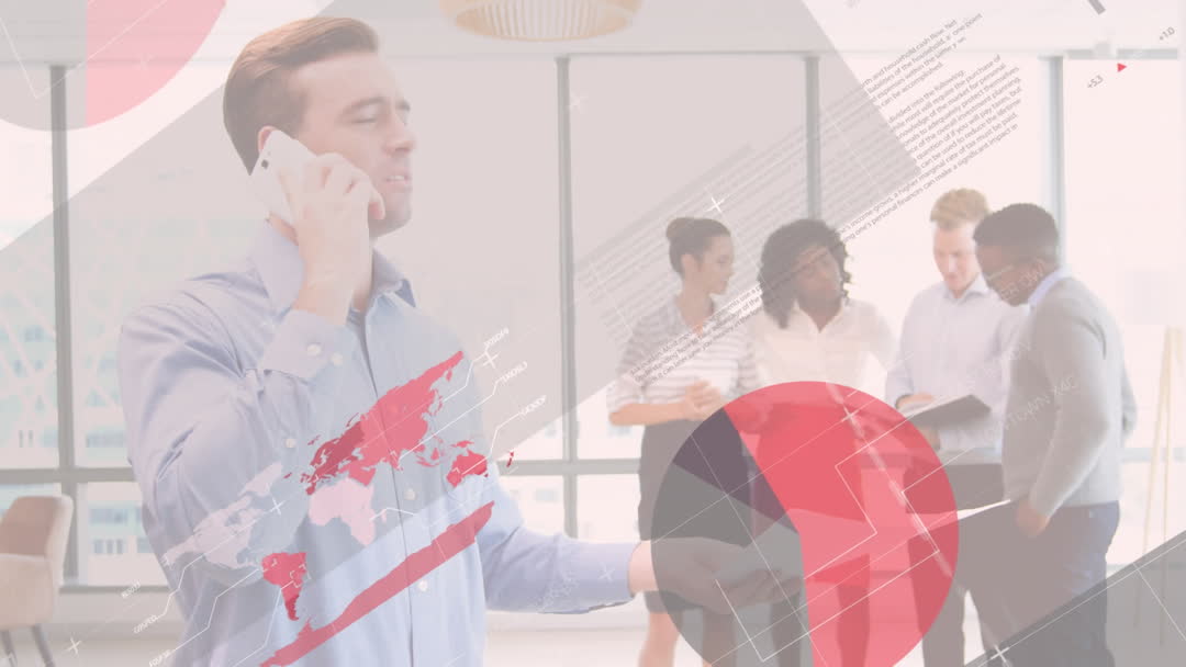 Group of business colleagues interacting with successful demeanor, enhanced by overlaid digital graphics and animated globe. Ideal for illustrating globalization, modern business strategies, technology integration, and effective communication in corporate environments. Suitable for business presentations, technology ads, and publications on workplace collaboration.