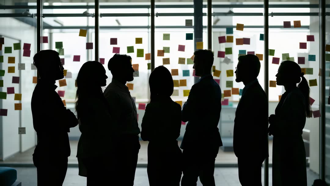 AI Generated Image. Showing seven silhouetted professionals standing before glass wall covered with colorful sticky notes. Backlit composition creating high-contrast silhouettes against bright office windows. Capturing focused brainstorming, strategic planning, agile sprint and design workshop energy. Camera options include slow dolly, gentle pan, rack focus shifting from faces to notes. Working well as b-roll for teamwork, collaboration, project management and innovation topics. Ideal for corporate presentations, website hero footage, social media ads, internal training, recruitment campaigns, startup pitches and productivity articles. Editing suggestions include adding subtle ambient music, voiceover narration, lower-third text overlays, animated sticky note callouts and speed ramps for dynamic cuts. Loopable short clip for transitions and opener sequences. Color palette featuring neutral interior tones with pops of neon from sticky notes. Licensing suitable for commercial use with standard editorial clearance.