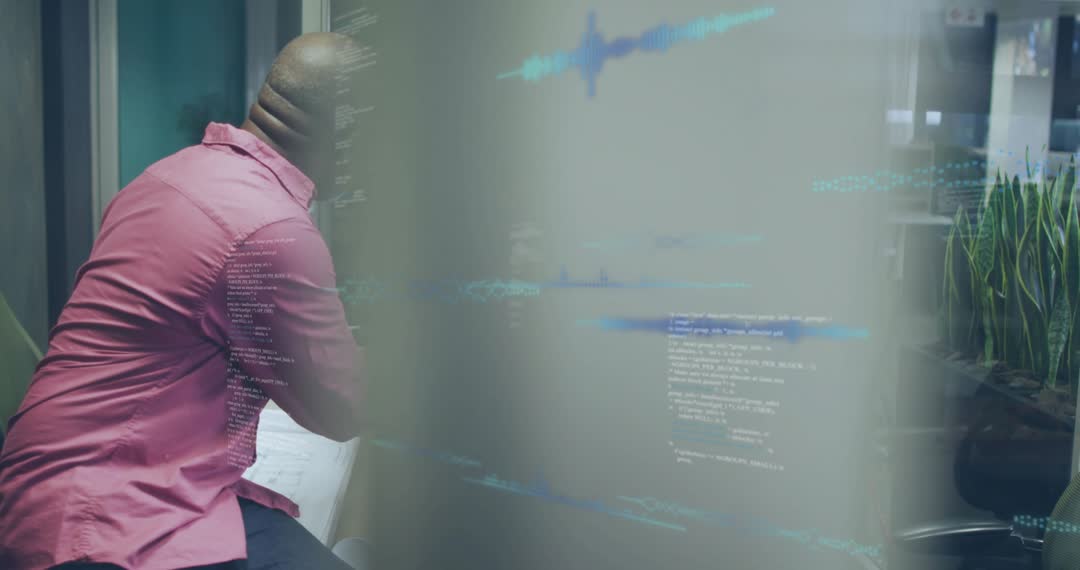 Video frame showing senior professional leaning over tablet while colleague placing laptop on plan and tapping screen. Blue streaks and code-like graphics flowing across glass conveying data exchange, real-time analytics and collaborative problem-solving. Composition highlighting teamwork, planning, boardroom interaction, modern office design, transparent surfaces and hybrid work technology. Use for corporate presentations, product demos, pitch decks, website hero banners, training videos and social media promos. Scene working well for messaging about software development, UX design, data visualization, digital transformation, agile workflows and innovation culture. Color palette and motion elements supporting dynamic, tech-forward brand storytelling and visual emphasis on collaboration.