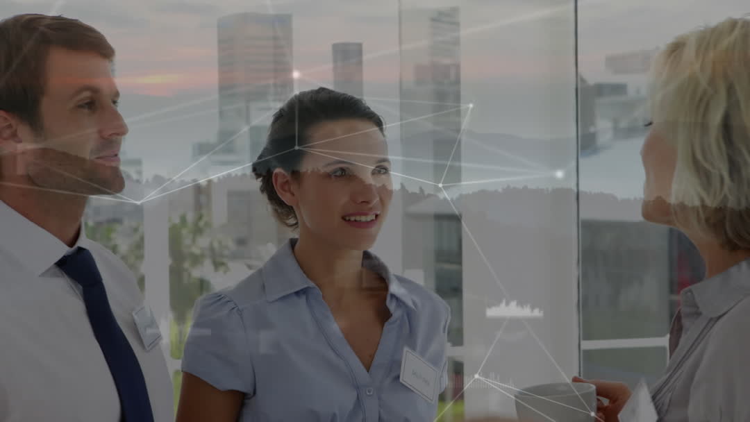 Business professionals are discussing innovative technology solutions while visual elements, such as interconnecting lines and abstract network patterns, overlay a scenic city view through large windows. This video symbolizes global connectivity, modern business interactions, and technological advancements in an office setting. Ideal for representations of team collaboration, futuristic business concepts, tech industry projects, or corporate networking themes.
