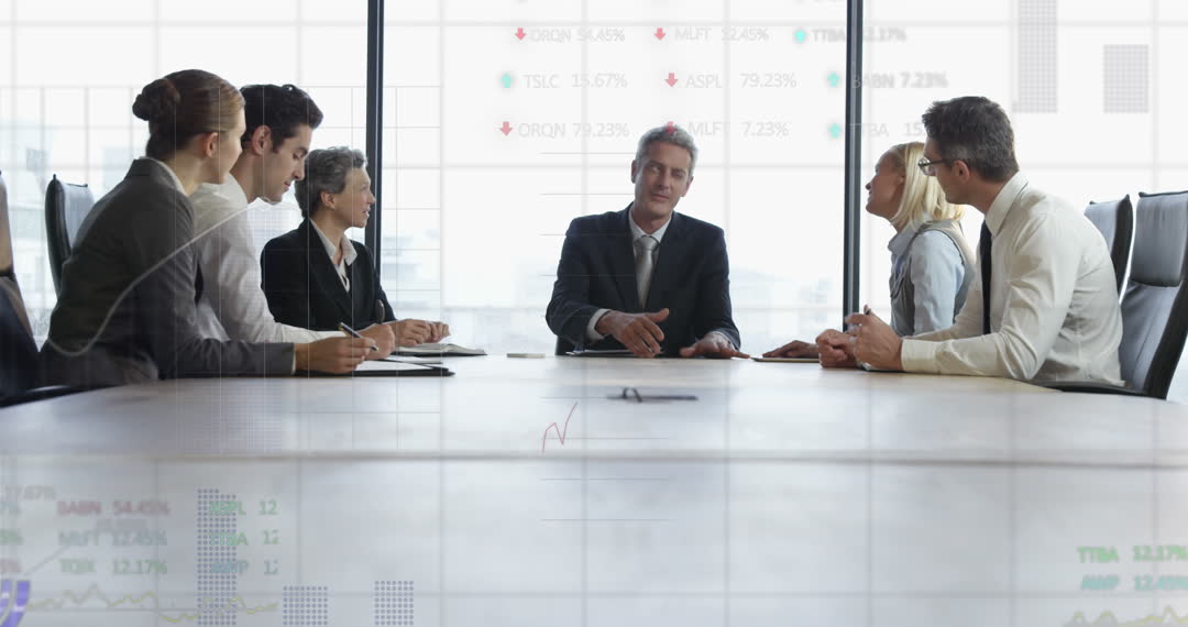 Group of business professionals discussing strategies for the stock market with overlay animations depicting trading data and metrics in an office setting. Ideal for use in contexts involving financial industries, teamwork collaboration, strategic planning, and corporate discussions reflecting modern digital environments.