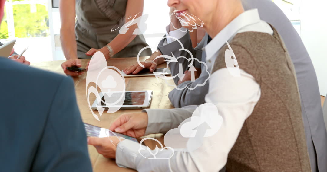 This video depicts a diverse group of business professionals collaborating using tablets with overlaid icons representing digital connectivity and cloud computing. Ideal for illustrating modern workplace technology, digital collaboration, or articles about technology integration in business environments.