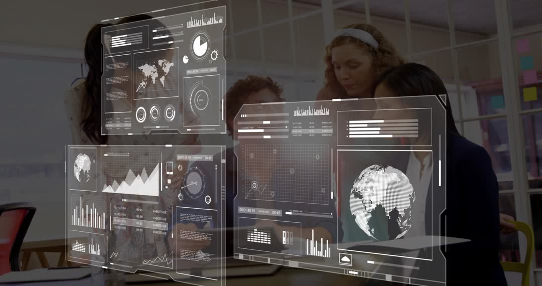 - Business team collaborating with augmented reality dashboards and global data visualization