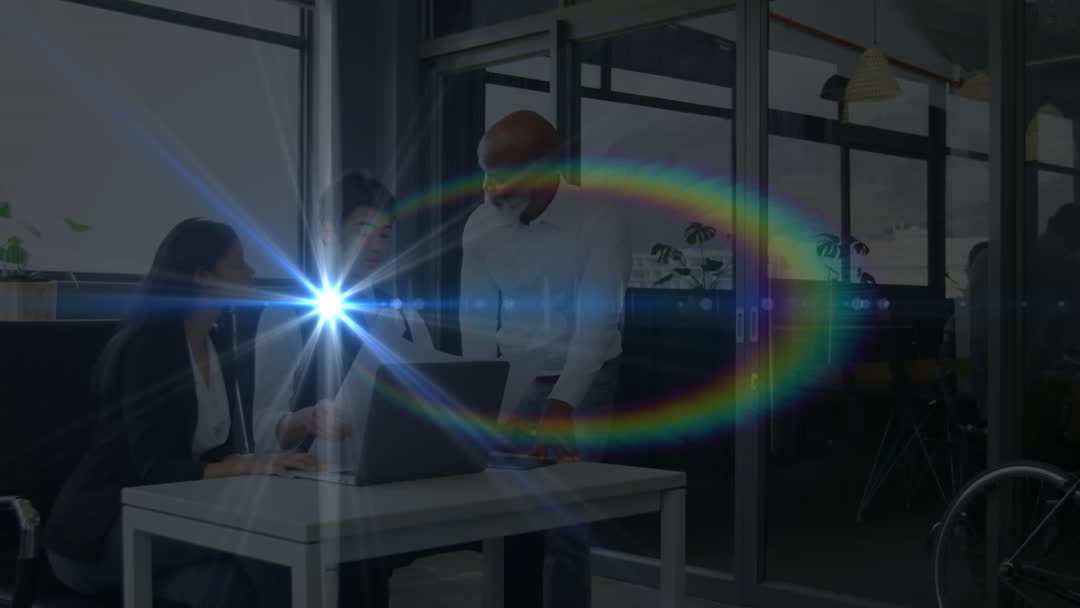 Business Team Collaborating with Digital Lens Flare Effect Video