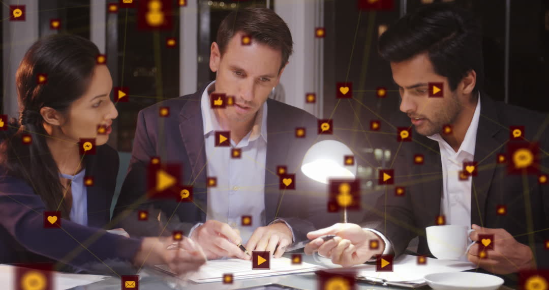 Business professionals collaborating over documents with a digital network concept overlay. This is ideal for corporate presentations, illustrating teamwork in a digital age, business strategies involving technology, or highlighting global network dynamics in office settings.