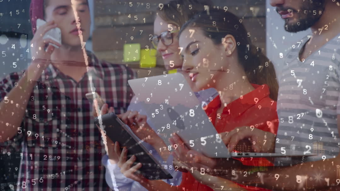 Business professionals are engaging in team collaboration while interacting with digital technology. A diverse group uses laptops and tablets, emphasizing modern communication methods. A dynamic set of transparent numeric data overlays symbolizes technological advances and analytical processing. Suitable for illustrating teamwork, digital transformation in business settings, or innovative uses in technology for marketing materials and informational content.