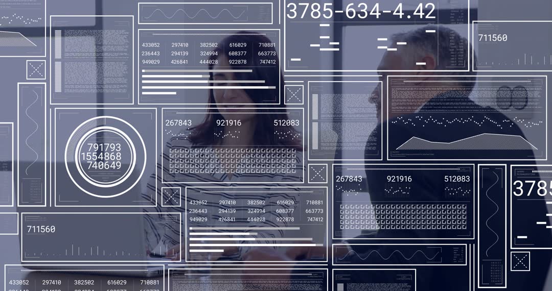 Video showing business team collaborating in glass-walled office while interactive analytics dashboard overlays screen with charts, graphs, numeric readouts and HUD elements. Woman gesturing and man checking laptop while handshake sealing deal in background. Footage combining live-action office interactions with digital overlays to convey data-driven decision making, teamwork, negotiation and professional communication. Usage suggestions: use in corporate presentations explaining analytics strategy, technology demos for dashboard or BI tools, fintech marketing, consulting websites, investor pitch videos, training modules on data-driven sales and news segments about business or technology. Clip working well for intros, lower-thirds, transitions and hero banners; supporting on-screen text and logo placement. Video delivering modern polished look with flexible edit points and room for voiceover.