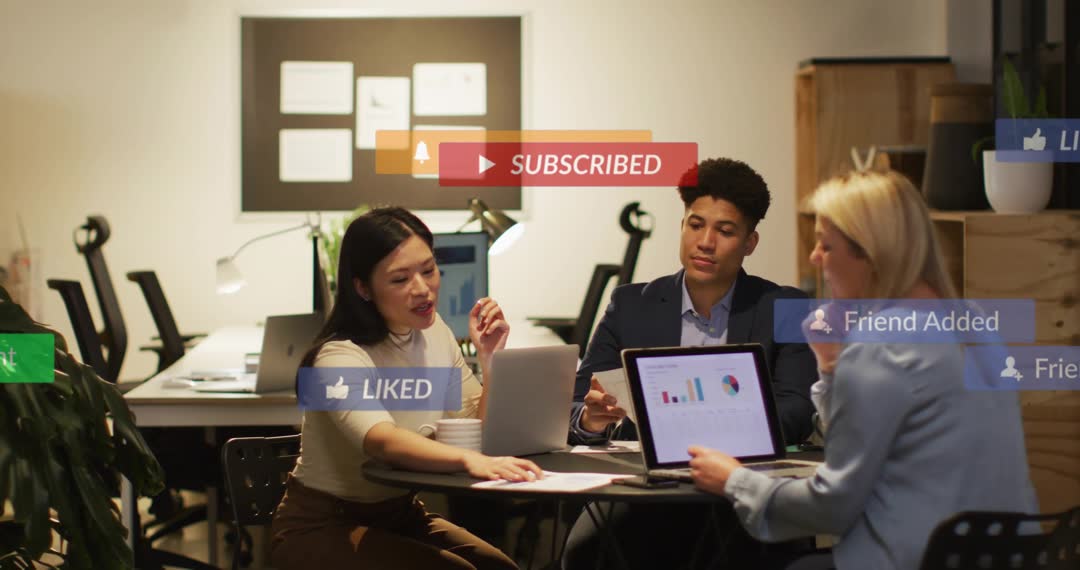 This video captures a business team discussing charts for a report in a modern office. Social media pop-ups like 'Subscribed,' 'Liked,' and 'Friend Added' are seen, highlighting digital connectivity. Ideal for content on teamwork, digital transformation in workplaces, or presentations on integrating social media and business strategy.
