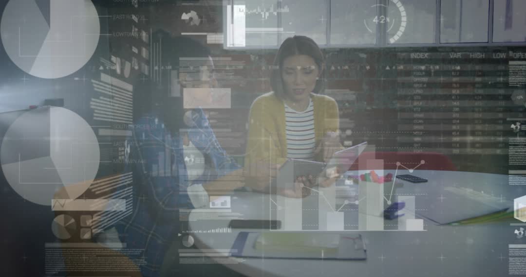 Video showing two colleagues collaborating at roundtable, using tablet to review interactive charts and dashboards. Augmented data overlays presenting metrics, pie charts, bar graphs and line charts over workspace. Scene capturing sunlight through windows and informal office atmosphere, conveying creative meeting flow. Footage working well for corporate presentations, training videos, fintech marketing, analytics platform demos and investor pitch decks. Ideal for website hero banners, social media ads, internal communications and e-learning modules focusing on data-driven decision making and team collaboration. Suggested edits including adding lower third titles, on-screen callouts, background music and voiceover narration. Color palette remaining neutral and professional, allowing easy branding and text overlay.