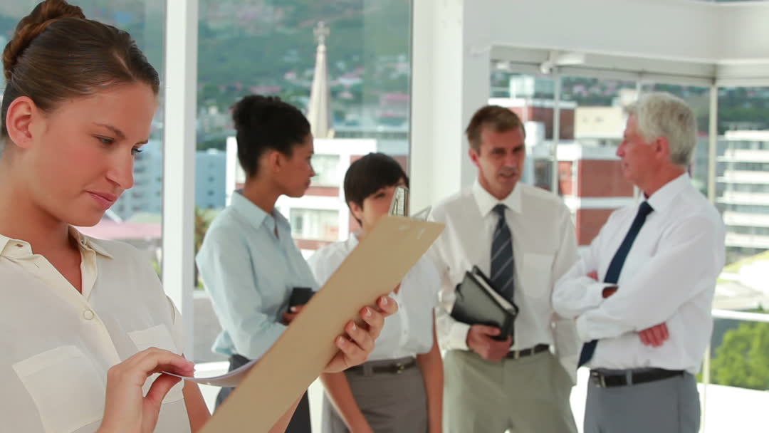 Group of business professionals engaged in a discussion. Diverse team stands in a bright, modern office commenting on financial figures. Ideal for content on teamwork, professional settings, corporate meetings or office cooperation.