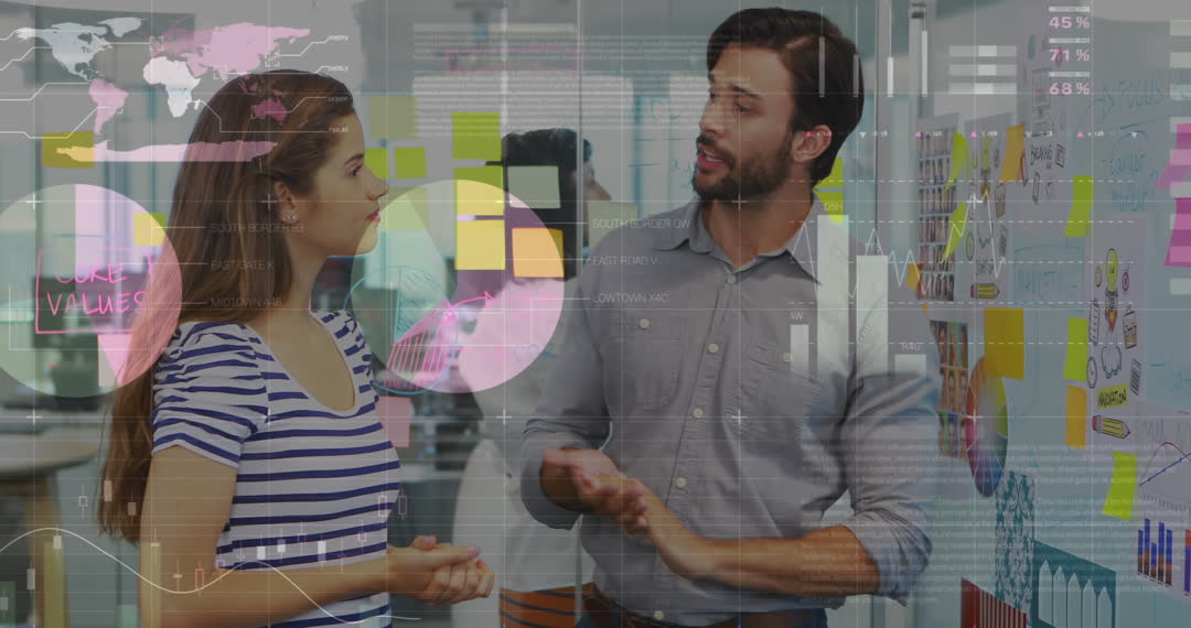 Visual of a business team interacting, with a digital overlay of charts and data. Ideal for illustrating concepts like teamwork or digital transformation in business settings. Useful in content discussing workplace innovation, data-driven decision making, and modern office environments.