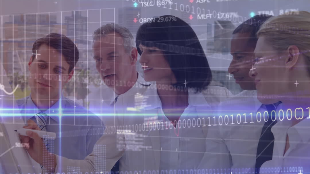 Diverse group of business professionals collaborating on digital tablet while financial data overlays suggest integration of technology and teamwork in modern corporate environments. Useful for articles regarding effective business strategies, team collaboration, and integration of financial technology in corporate strategies.