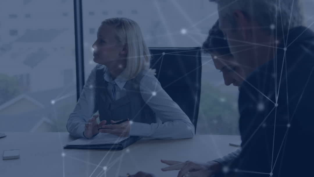 Group of business professionals engaged in discussion, visually superimposed with digital network overlays symbolizing technology integration and connectivity. Useful for illustrating modern corporate settings, team building, technological advances in business communication or concepts related to networking and collaboration in professional environments.